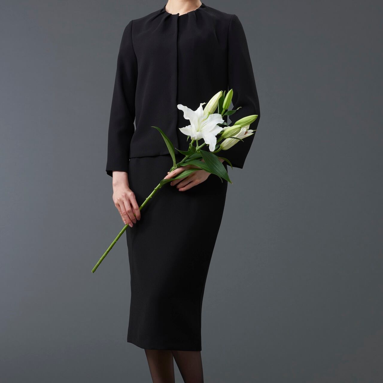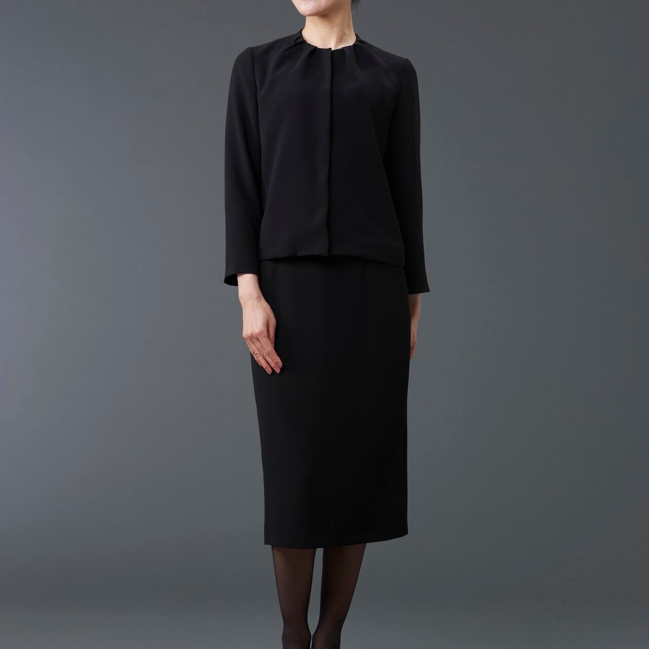 ウエスト部分にはさりげなく光沢のある素材を採用しており、普段のスタイルにも品よく映えるアクセントに。シンプルなトップスとの相性も良く、喪服としても普段使いとしても幅広く活用できます。