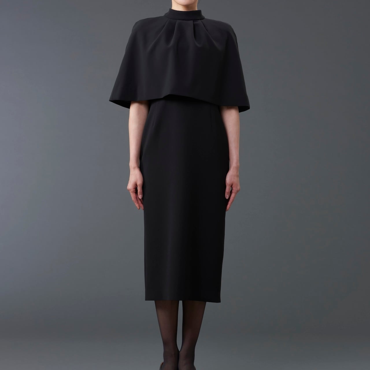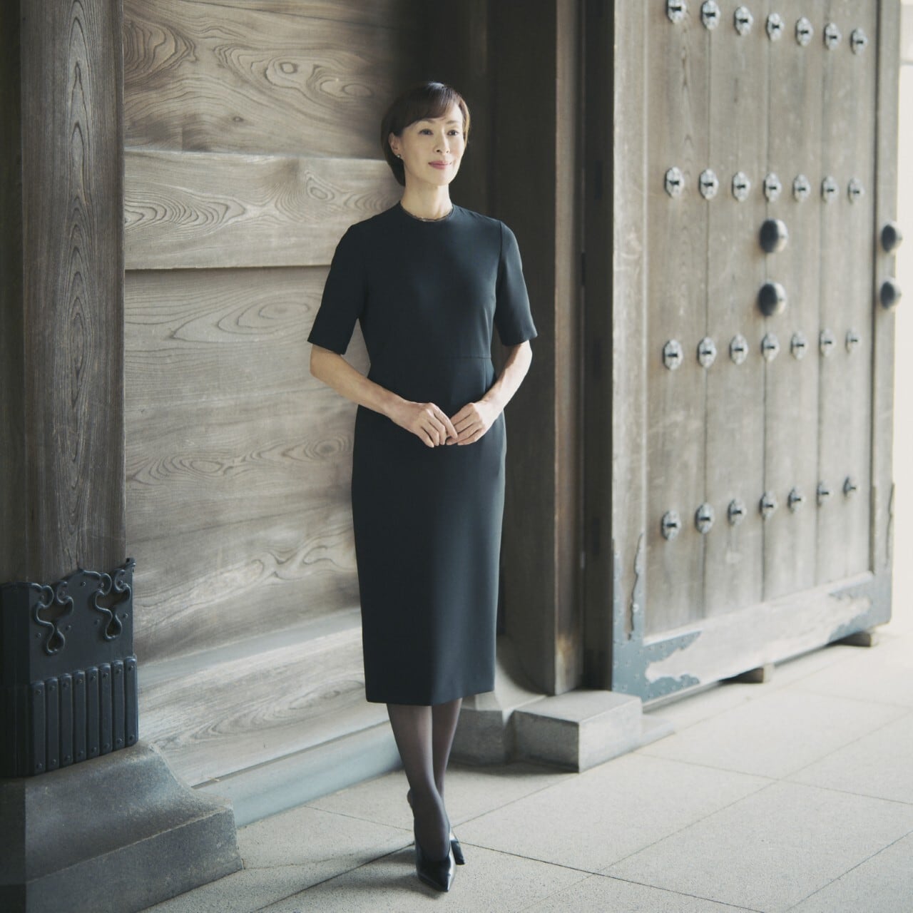 「少し長めの丈」がこのワンピースのシルエットの鍵となるポイント。通常の喪服とは一線を画す、洗練された印象を生み出します。